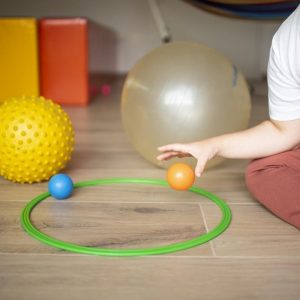 Questi gli strumenti: blocchi psicomotori, palline sensoriali luminose, gioco dell’equilibrio a dondolo foglia, grande palla per psicomotricità 75 cm, torre dei bicchieri.